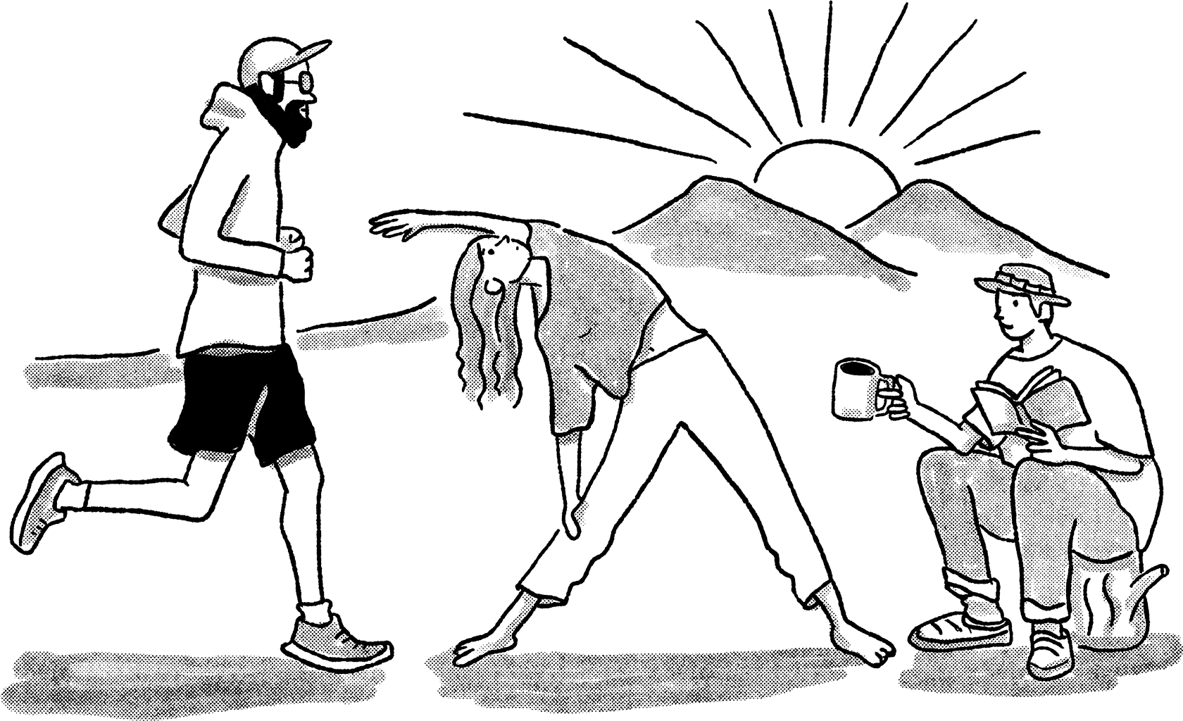山に登らずに家族で焚き火を囲んでみたり、ローカルビールを片手に仲間と集ったり、ルーフトップから夕陽を眺めたり、テラスで本と向き合う時間を一人で楽しんだり。